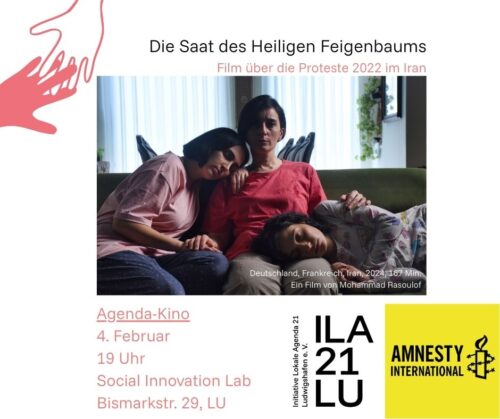 Gemeinsam mit der ILA Ludwigshafen zeigten wir den Spielfilm „Die Saat des Heiligen Feigenbaums“, zu dem wir viele neugierige und interessierte Menschen begrüßen durften. Vor Beginn des Films stellten Mirijam Alberti von der ILA sowie Barbara Kohlstruck aus unserer Gruppe kurz ihre jeweiligen Organisationen vor. Beide fassten sich bewusst knapp, denn der Film selbst hatte Überlänge.