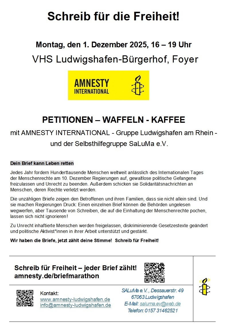 Kommt zu uns ins Foyer der VHS. SaLuMa e.V. warten nach eurer Unterschrift mit Kaffee und leckeren Waffeln auf euch.