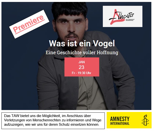 Im Anschluss an die Premieren-Vorstellung hat das Publikum die Möglichkeit, mit unserer Gruppe ins Gespräch zu kommen. Wir informieren über aktuelle Verletzungen der Menschenrechte weltweit und zeigen auf, wie jede*r von uns zu ihrem Schutz beitragen kann – von konkreten Aktionen bis hin zu langfristigem Engagement.